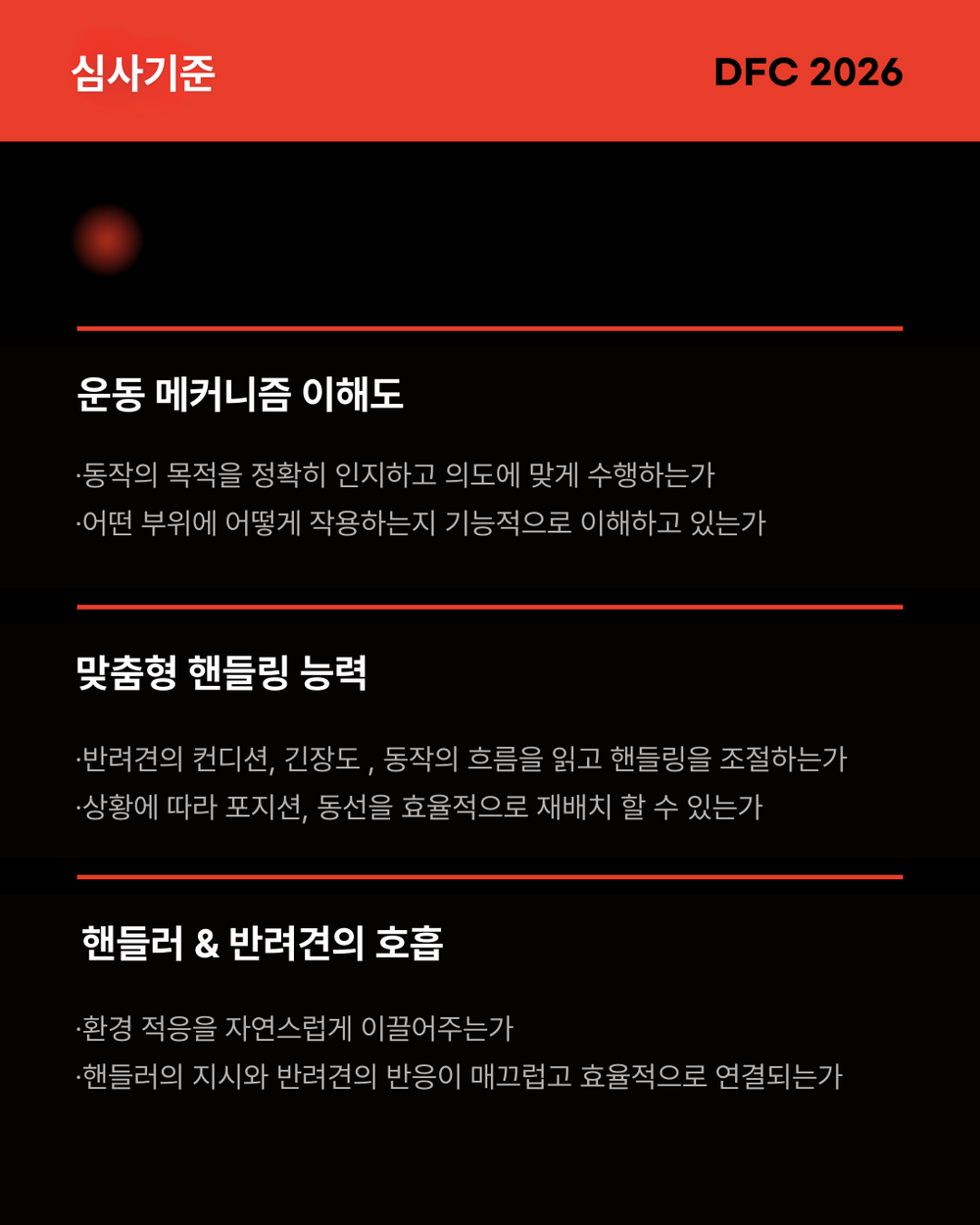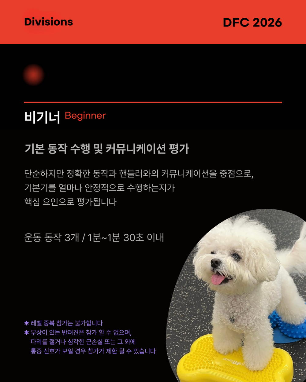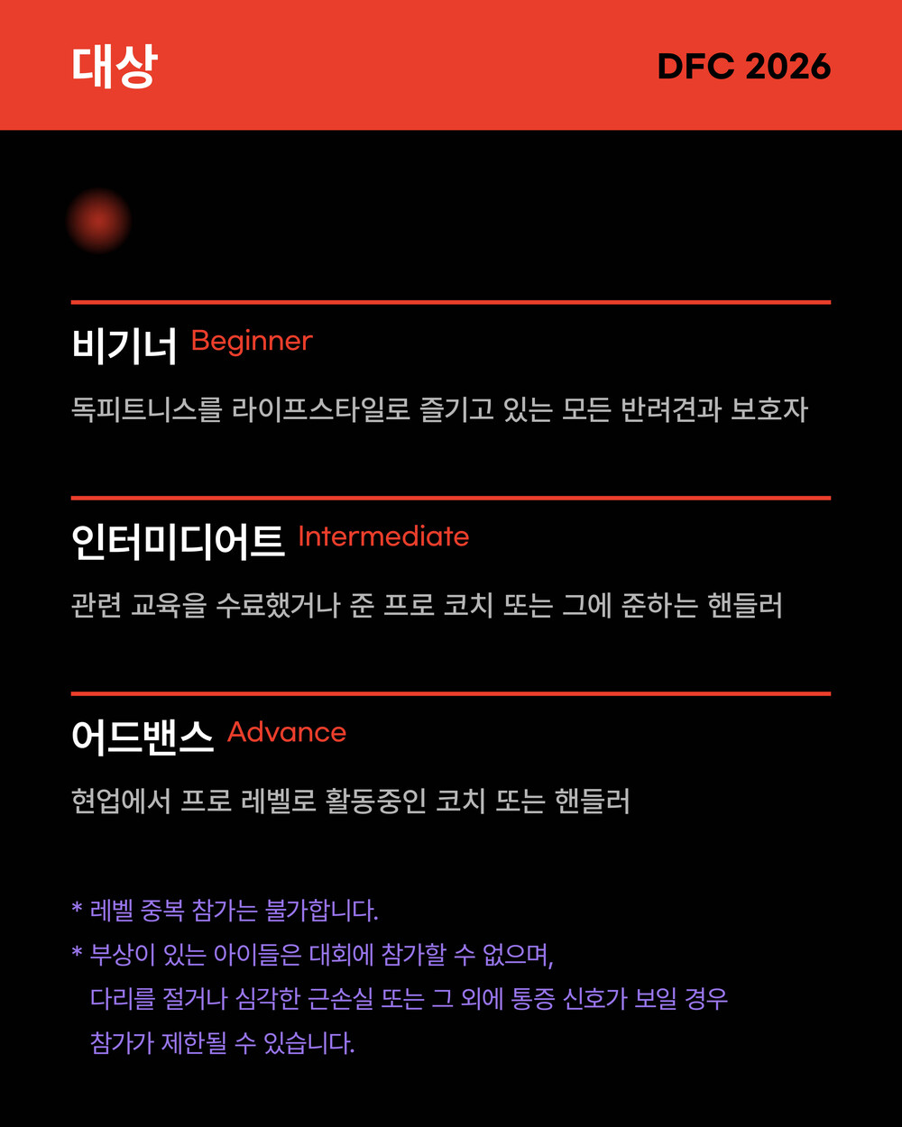 - 반려견의 집중력과 안전을 위해 핸들러와 반려견만 대회장 입장이 가능하며 참관 또한 불가능합니다.